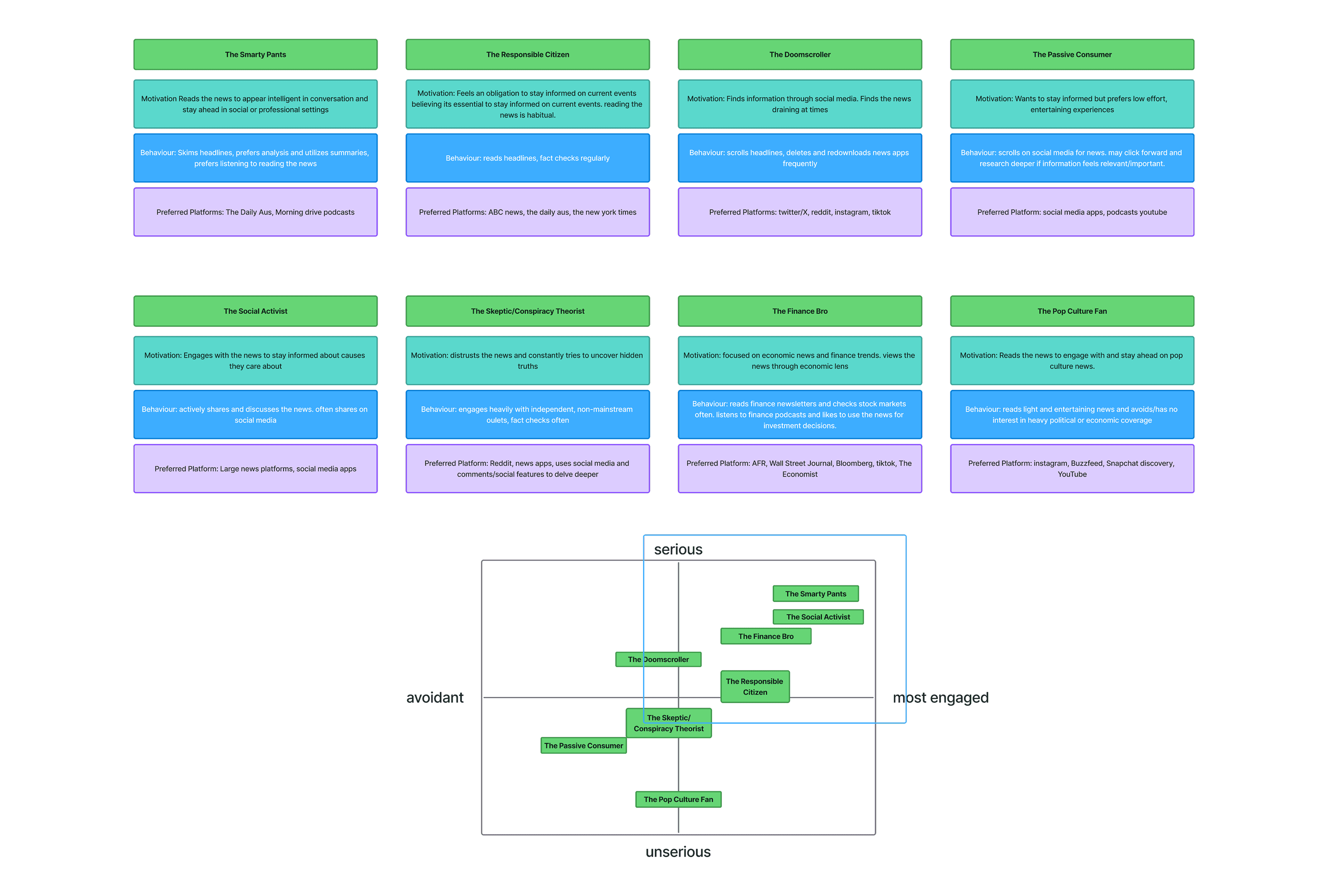 Therefore, we gradually shifted toward more intrinsic motivators instead of reacting to surface-level behaviours: what truly drives young Australians to engage with the news? Through quick peer interviews and a review of the data we collected, we identified recurring themes that led us to develop the eight user profiles below.