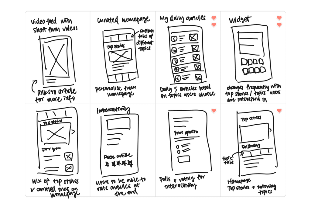 During the initial ideation stage, through methods like crazy 8s and brainwriting, we focused on ideating different engaging and digestible features such as personalised feeds, attention-based formats, interactive quizzes, widgets. However, we realised that those ideas only offer short-term novelty, which led us to shift our focus.