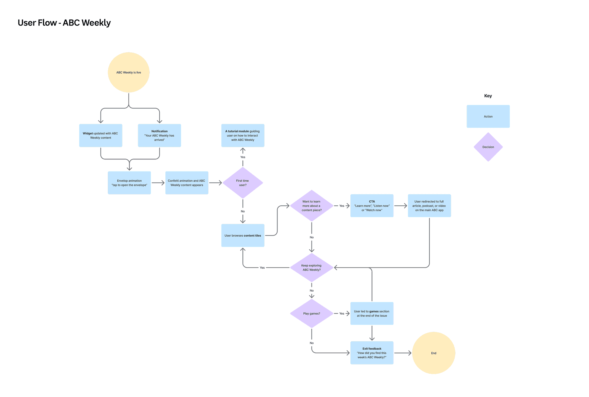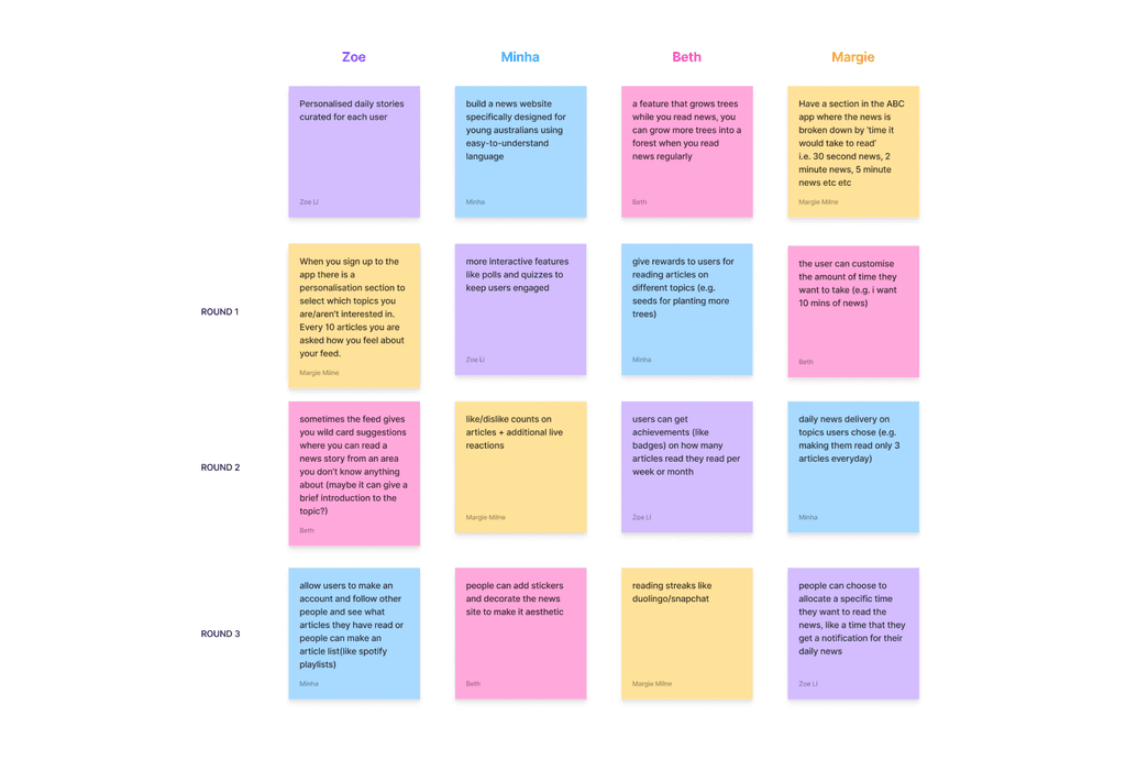 While ideas like reward-based gamification (e.g. points or streaks) initially showed potential for engagement, critical reflection guided by tutor feedback and ABC’s public service values revealed that short-term novelty did not align with ABC’s goal of building a meaningful, long-term relationship with young audiences. We also considered that such features do not provide an overarching solution that truly resonates with users.