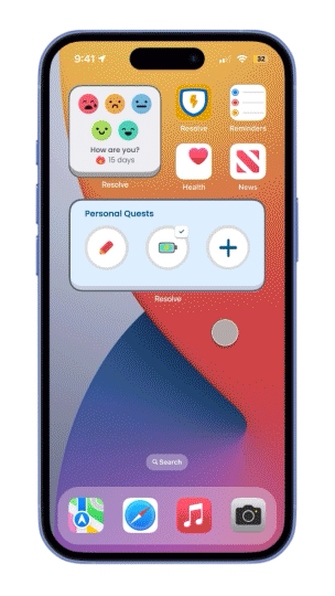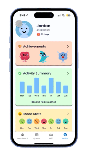 Resolve is a gamified mental health tracker that is designed to help young men prioritise their mental well-being. It features mood tracking, personalised tasks, and a safe space for users to share their feelings and connect with a supportive community. Each week, users battle their "demons" to track their progress in a tangible way while engaging with tailored resources and interactive rewards, making mental health more accessible and empowering.