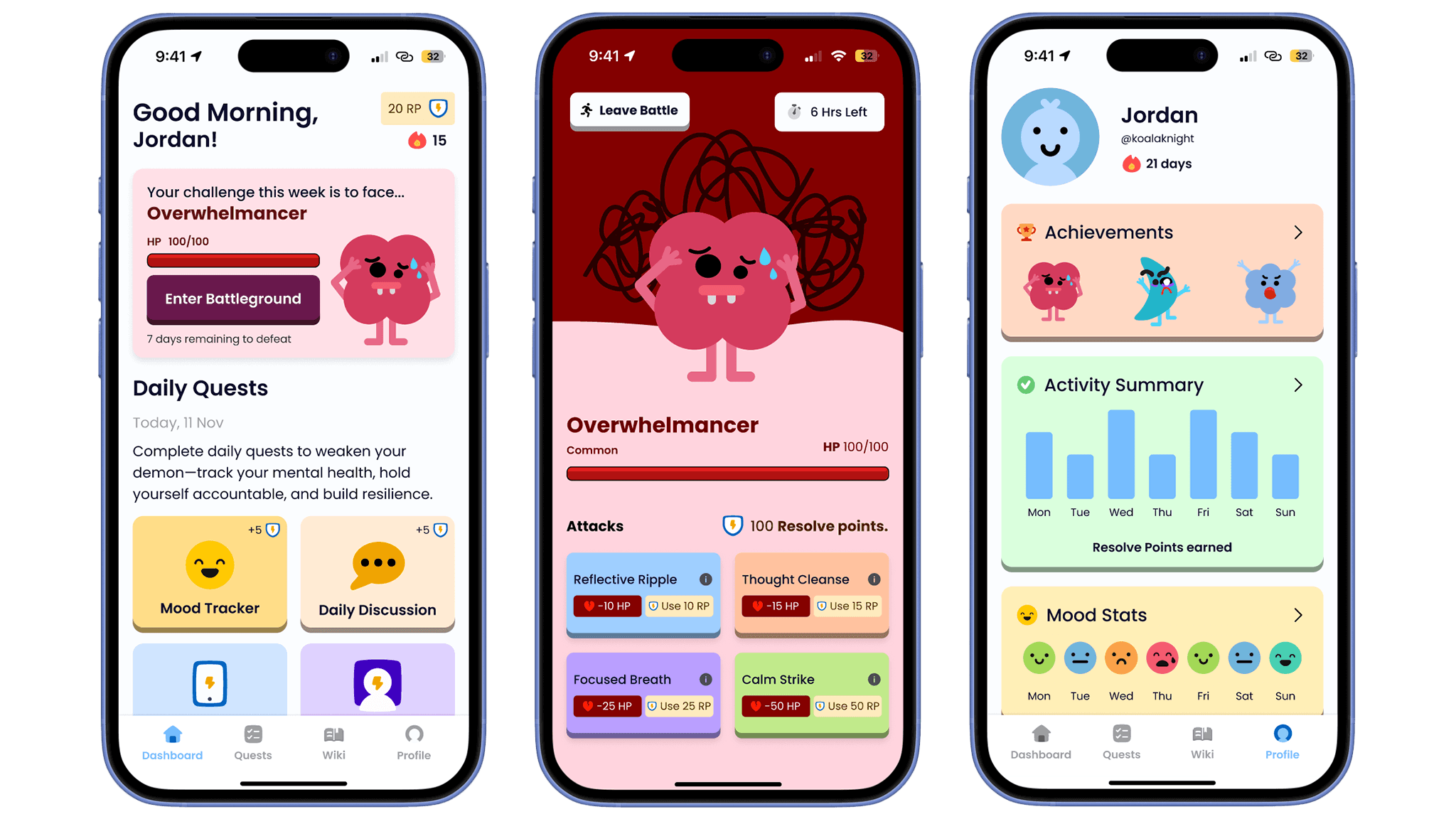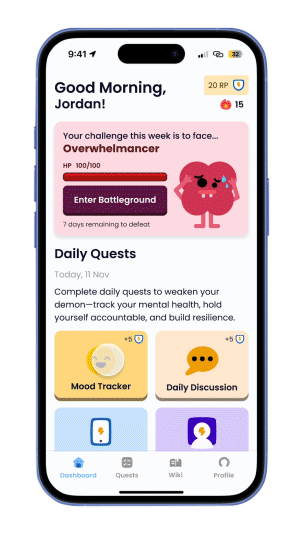 Each week, users face a unique demon tailored to their previous mood tracker responses, representing their current challenges. Every demon comes with personalised strategies and tasks to help users overcome it.