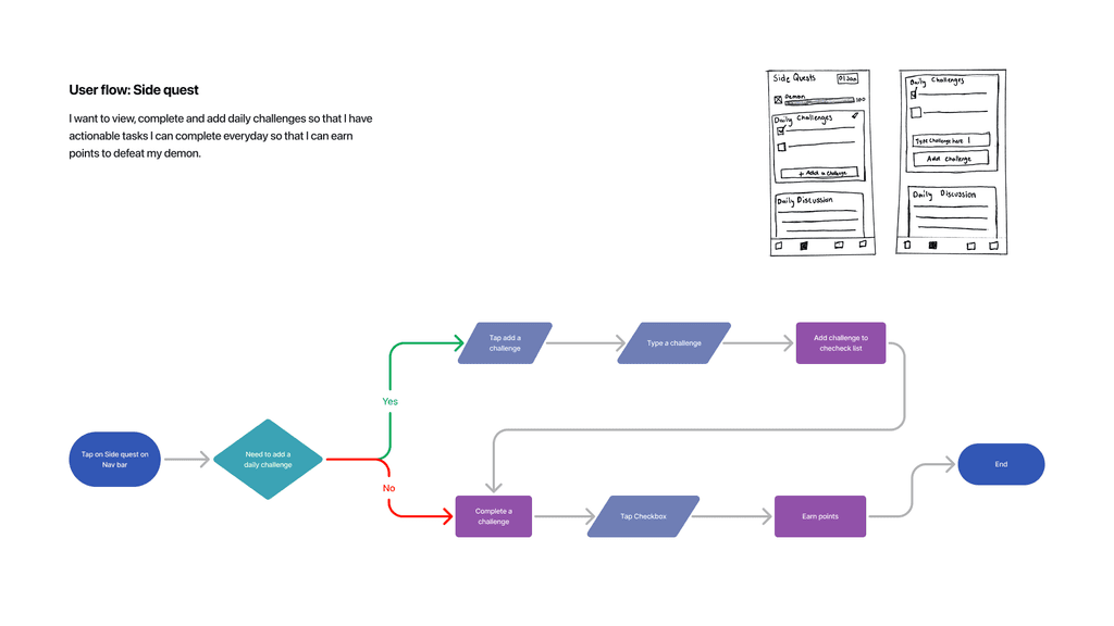 Our chosen solution incorporated the best features from various ideas. The app centres around users battling their "demons" at the end of each week. Users complete a series of daily tasks over the week to manage their mental health and gain points, making self-care engaging and rewarding.